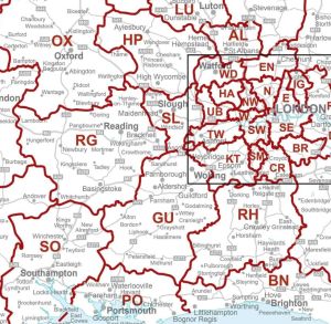 Las áreas postales reciben su nombre nemotécnico de la ciudad principal (por ej., AL para St. Albans), aunque algunas reciben el nombre de ciudades más pequeñas o áreas regionales. Londres está dividido en 8 puntos cardinales (SE = South East, SW = South West…)