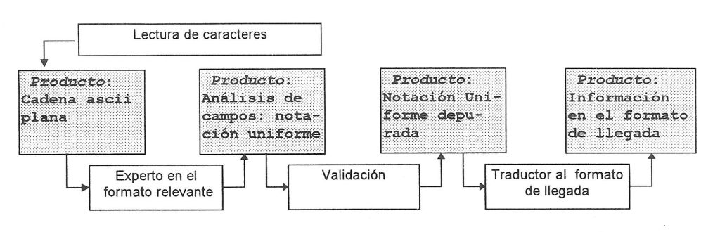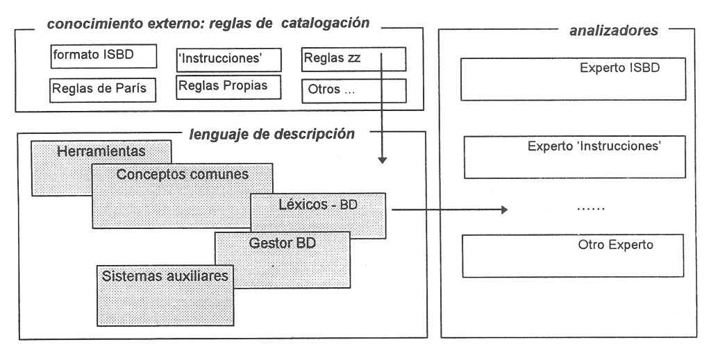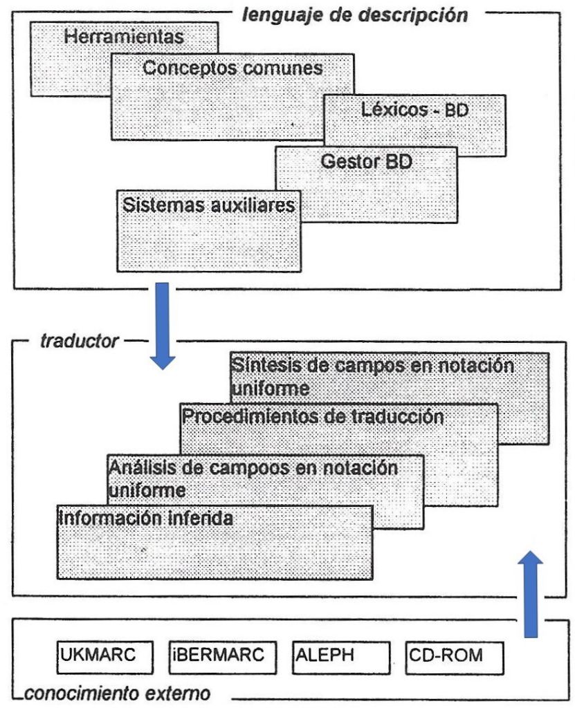 Estos instrumentos operan en forma similar al shell o núcleo de un sistema de definición de sistemas expertos, con la particularidad de que el conocimiento aquí recogido es fundamentalmente lingüístico y biblioteconómico: cada experto es un analizador (parser), definido por medio del lenguaje de descripción de documentos, que conoce un tipo de catalogación bibliográfica y puede reconocer el formato de una clase de fichas ─y sus variantes─ y procesar la información que contienen. Hay dos transformaciones esenciales: del original a una especie de interlingua (lenguaje común intermedio), lo que hemos llamado notación uniforme, y de ésta al formato de llegada seleccionado.