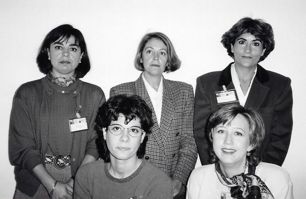 Equipo de responsables de la organización de las V Jornadas. De pie: María-Teresa Pastor González (Biblioteca de la Facultad de Filosofía y Letras), María-Eugenia De Gabriel Marín (Biblioteca de la Facultad de Veterinaria), Lourdes Expósito Albuquerque (Biblioteca de la Escuela de Enfermería). Sentadas: María-Ángeles Mellado Miranda (diplomada en Biblioteconomía, miembro de la Secretaría de las V Jornadas) y María-Teresa Mateos-Fernández (Biblioteca General de la UEX, miembro de la Secretaría de las V Jornadas), todas ellas de la Universidad de Extremadura en Cáceres.