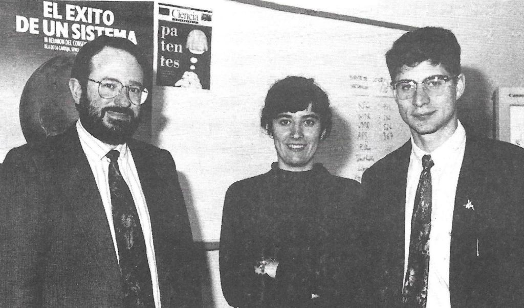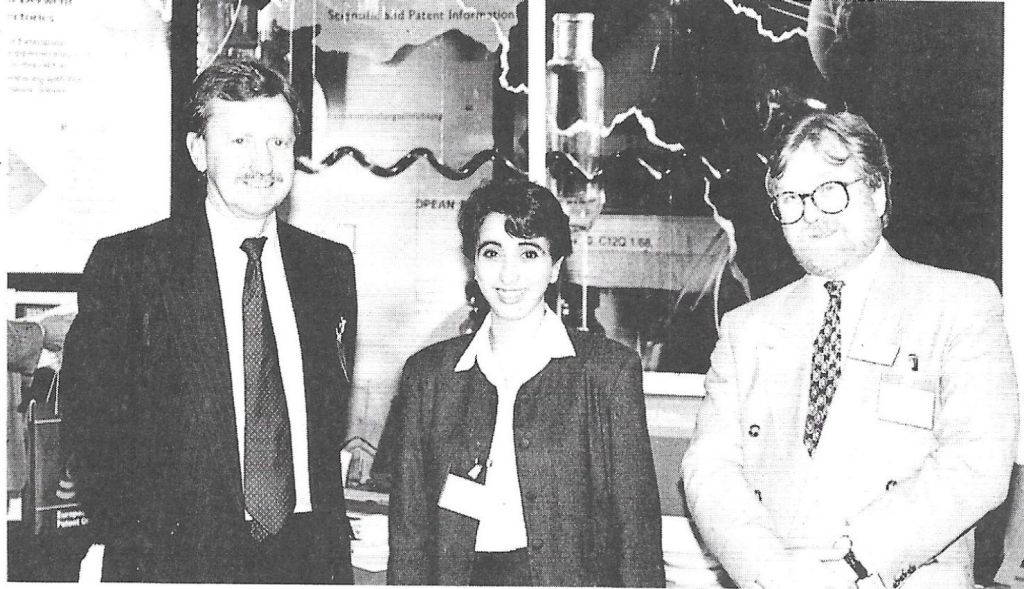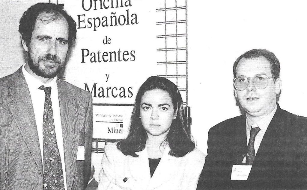 La Oficina Española de Patentes y Marcas (OEPM) –conocida hasta 1992 como Registro de la Propiedad Industrial (RPI)– estuvo presente con un stand atendido por Carlos Turmo Blanco (izq.), jefe de Sistemas Informáticos; Cristina Caminero Alonso, y Ricardo Albert Martínez, asesores técnicos.