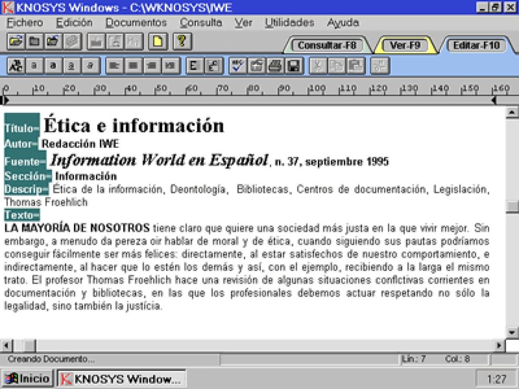 Knosys, el sistema de gestión documental que ostenta, con mucha diferencia, el mayor número de instalaciones en nuestro país, fue presentado recientemente en su primera versión para el sistema operativo Windows (v. IWE-42, marzo de 1996, p. 28):