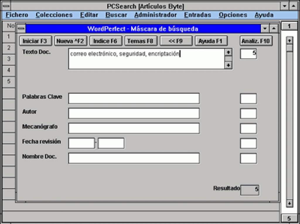 Sin embargo, a diferencia de otros sistemas similares, PC Search permite asociar a cada documento una ficha en la que pueden indicarse datos estructurales (autor, fecha, etc.) y descriptivos (título, tema, descriptores, etc.), que también son utilizables a efectos de localización y que eventualmente completan la indexación automática que realiza el programa.