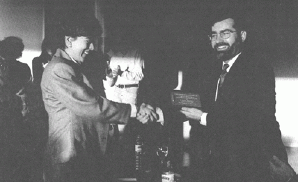 Eliana Benjumeda Azorín recoge de Pedro Hípola el Premio IWE’94 a la Mejor Personalidad. Gijón 1994.