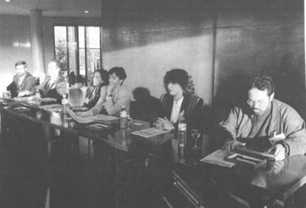 Presidencia del acto de entrega de los Premios IWE’94. Empezando por la izquierda: Pedro Hípola (UGR), Tomàs Baiget (Idescat), Francisca García-Sicilia Montero (Data-Star Dialog), Paloma Portela Peñas (CNMV), Pilar Sánchez Vicente (Gob. Principado de Asturias) y Lluís Codina (UPF).