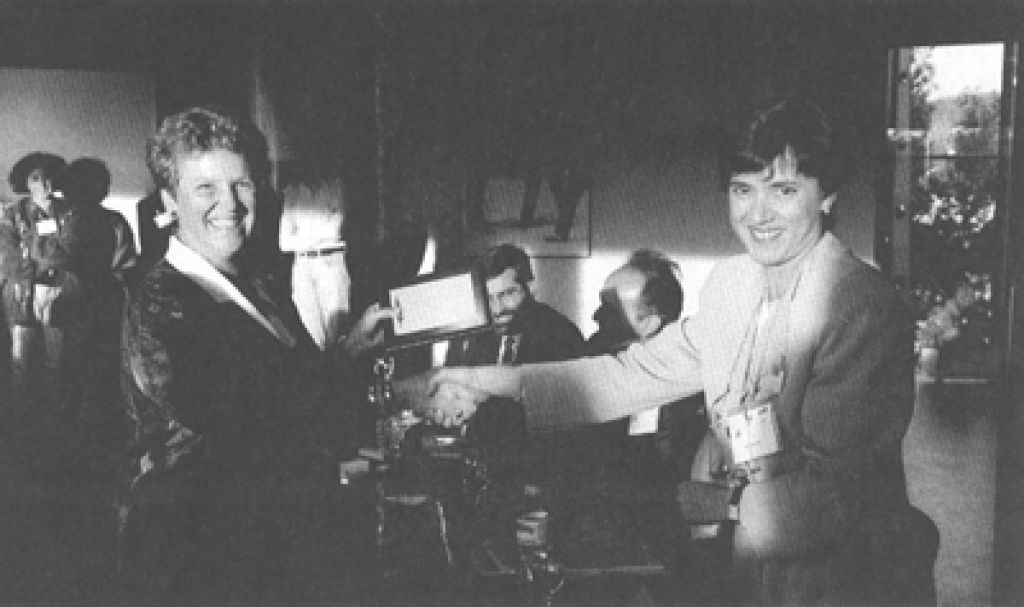 Rosa de la Viesca recibiendo de Paloma Portela Peñas, presidenta de Sedic, la placa conmemorativa del Premio IWE’94 a la mejor Personalidad. Gijón 1994.
