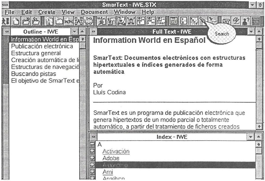 Un hiperdocumento SmarText comprende tres secciones principales, cada una de las cuales está ubicada en una ventana independiente, y un sistema documental completo de recuperación de información (figura 1).
