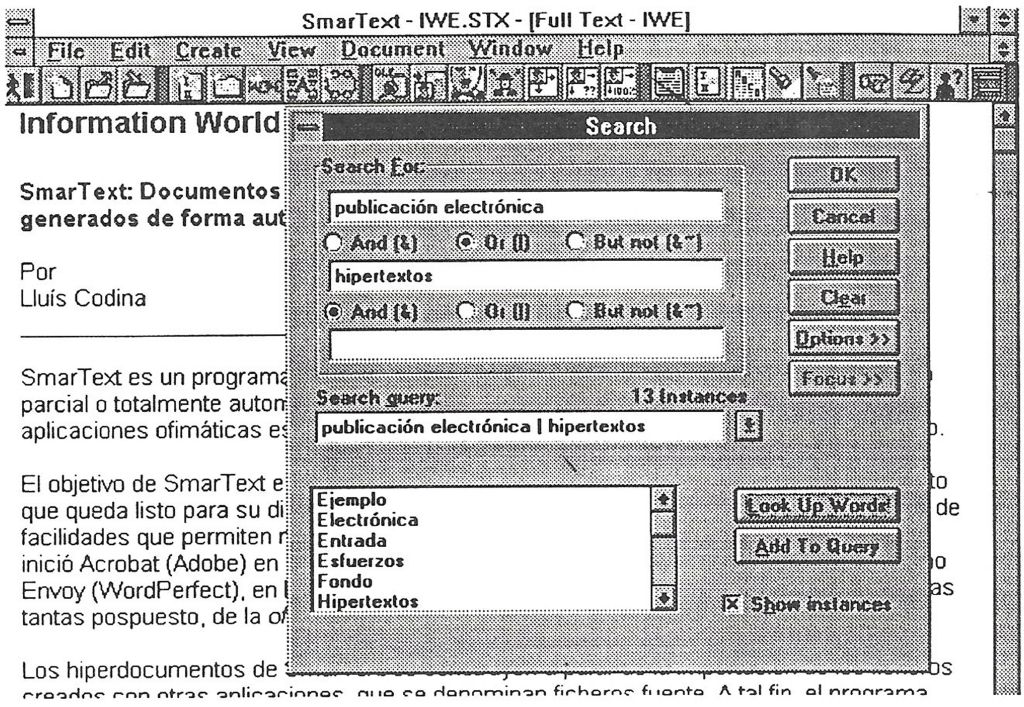 Estas entradas se comportan, de hecho, como auténticas macro-instrucciones de búsqueda, transparentes al lector, por lo cual una entrada puede tener asociada una ecuación completa de interrogación que combine términos, operadores booleanos y sinónimos. Por ejemplo, la entrada <Publicación electrónica> puede contener una macro anidada que lance la siguiente ecuación de recuperación : [(Publicación AND Electrónica) OR (Edición AND Electrónica) OR (Electronic AND Publishing)]. El resultado será que, cuando el usuario pinche con el ratón la entrada <Publicación electrónica>, SmarText le mostrará todas las zonas del documento que satisfacen la ecuación anterior. Además, cada entrada del índice acepta sinónimos, que debe declarar el usuario, y que lista bajo la forma: Véase también… (See also…).